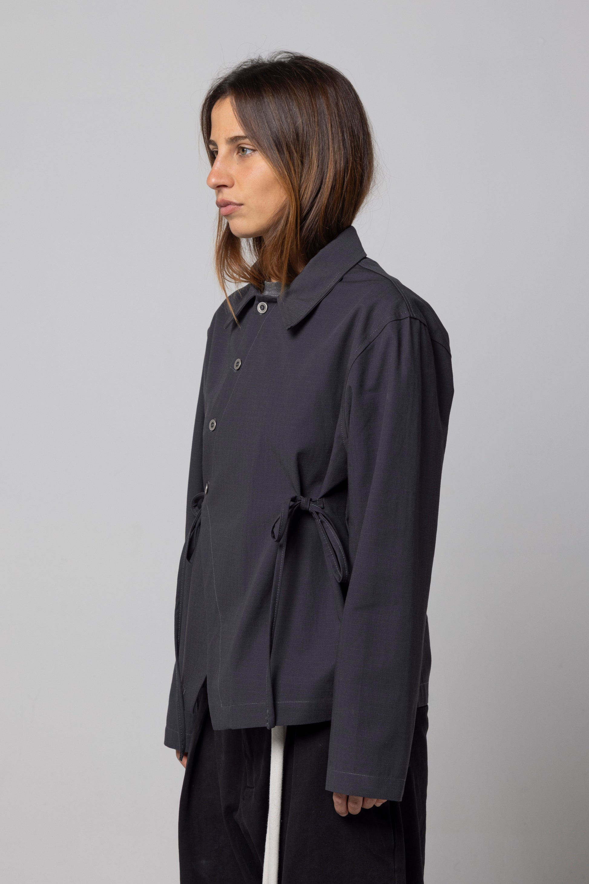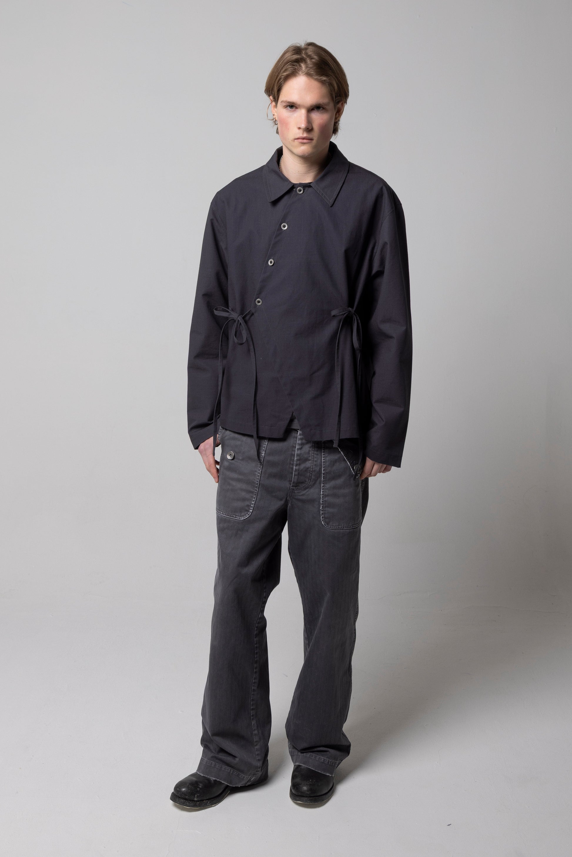 Camicia asimmetrica con lacci in 100% cotone rip-stop e bottoni con finitura in argento vecchio. Ispirata al mondo della sartoria giapponese, ma innovativa nelle sue forme e nei materiali.