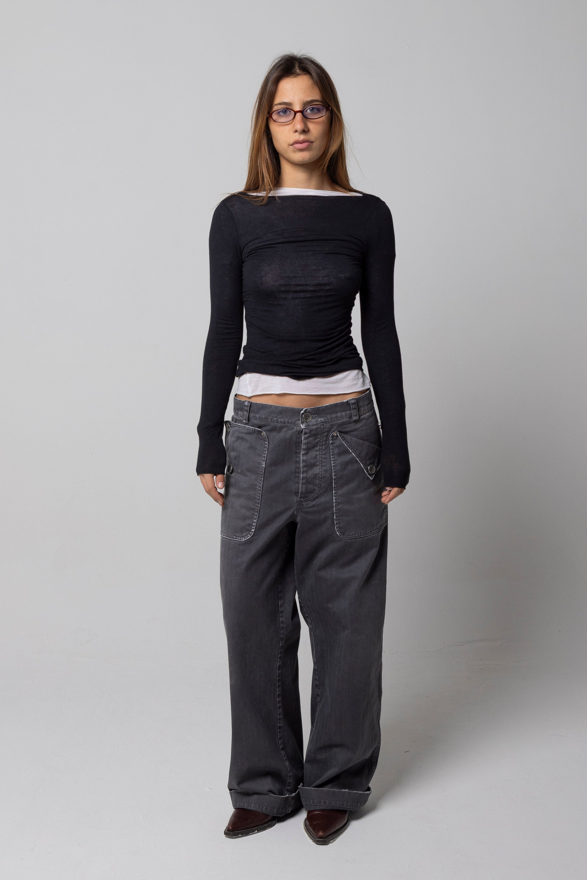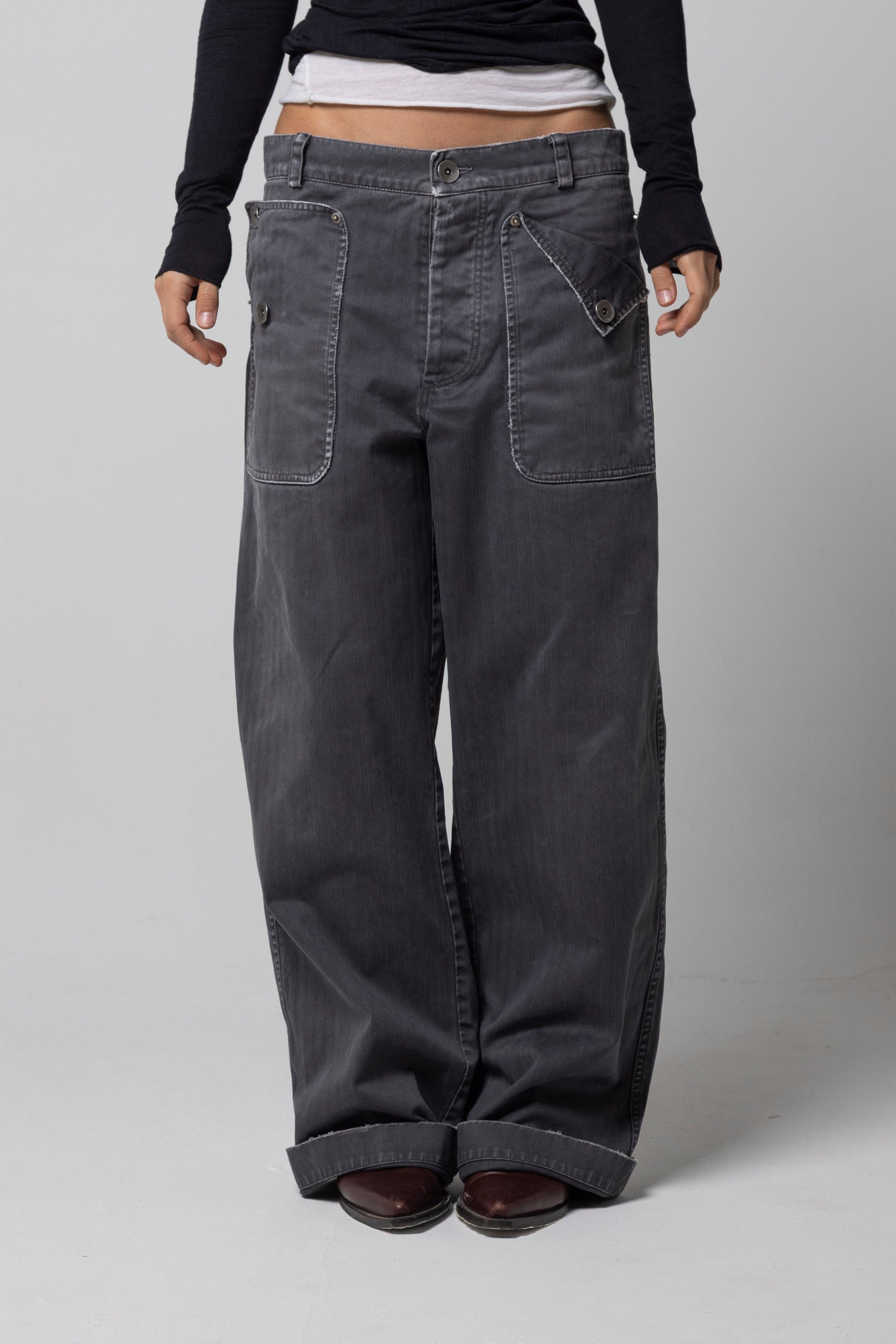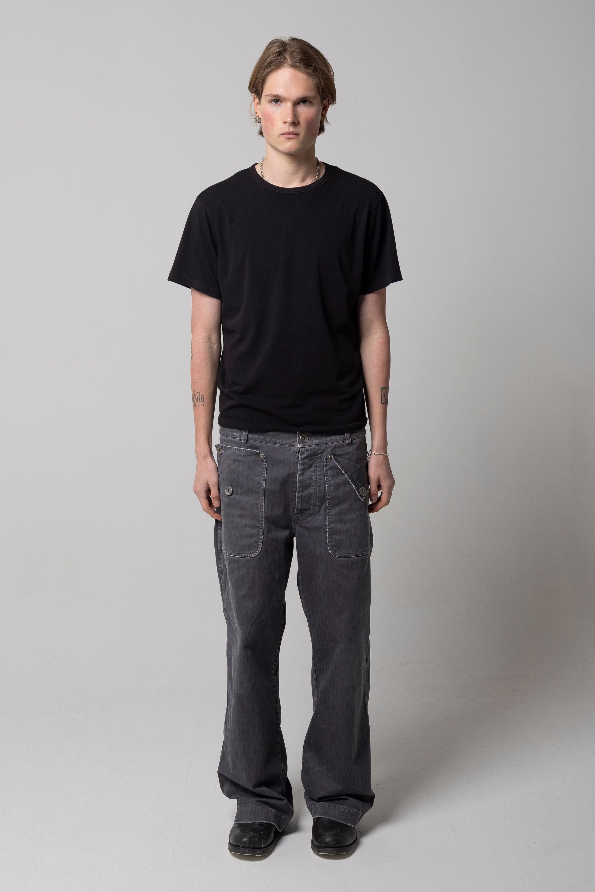 Ispirato dall’abbigliamento workwear vintage, questo pant è composto da un cotone Harringbone Twill ed è sottoposto ad un processo di tintura in capo per evidenziare la texture del tessuto e per dare un effetto di usura. Bottoni italiani in alluminio e rivetti con finitura argento invecchiato. Le patte consentono di mettere le tasche in sicurezza e di avere due design diversi in base alla chiusura del bottone.
