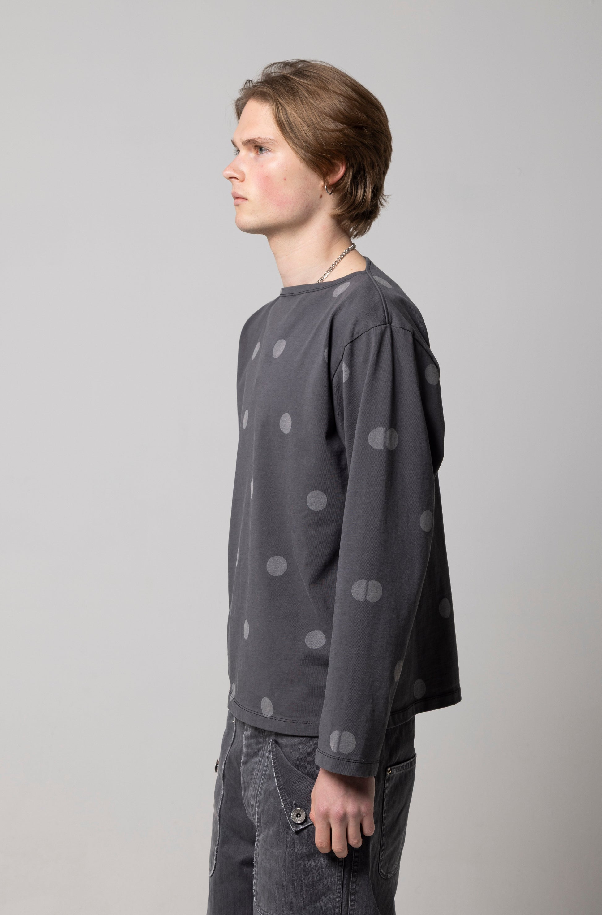 Maglia a maniche lunghe in 100% cotone 220gsm con processo laser per ottenere una decolorazione a pois. Collo a barchetta e vestibilità comoda.